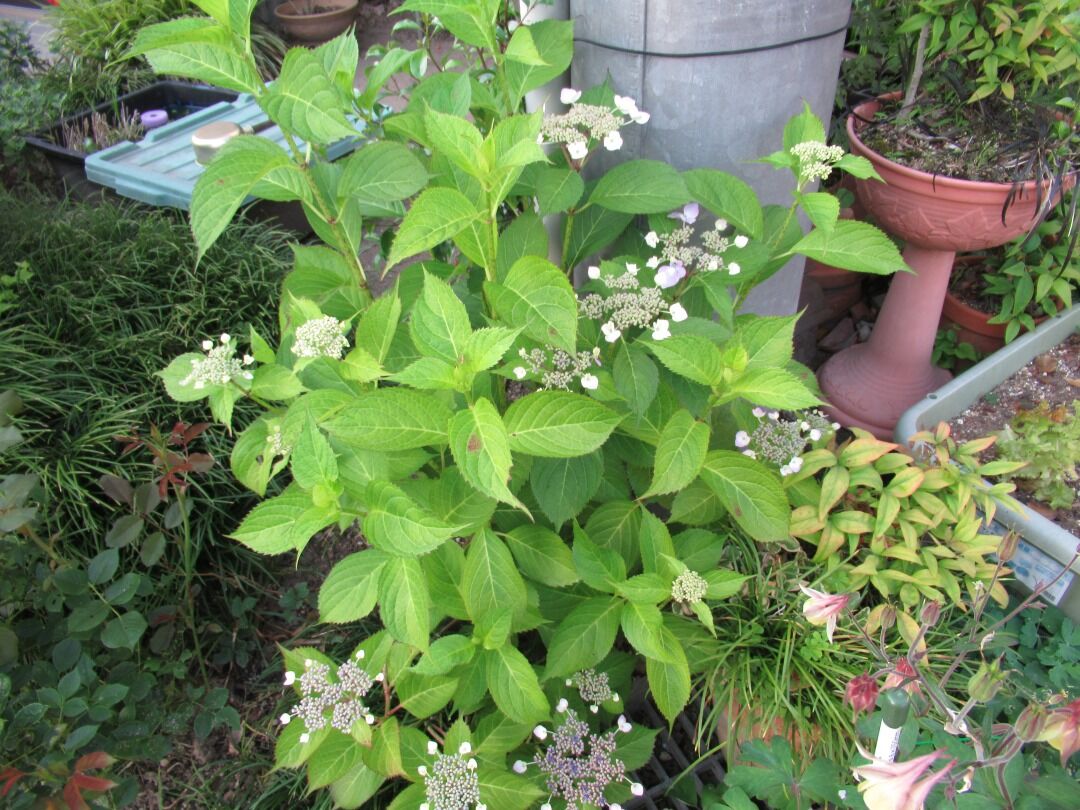 こちらガクアジサイ、地植えに苦土石灰を施すもは特に変化なし。この時期、一番目立つ花は紫陽花、雨に濡れる紫陽花はいいものです。